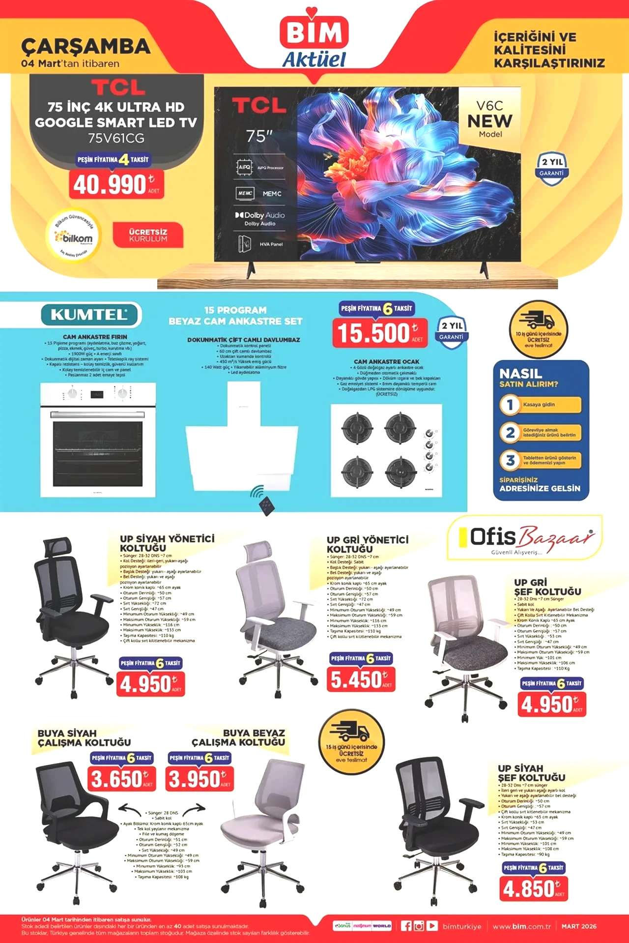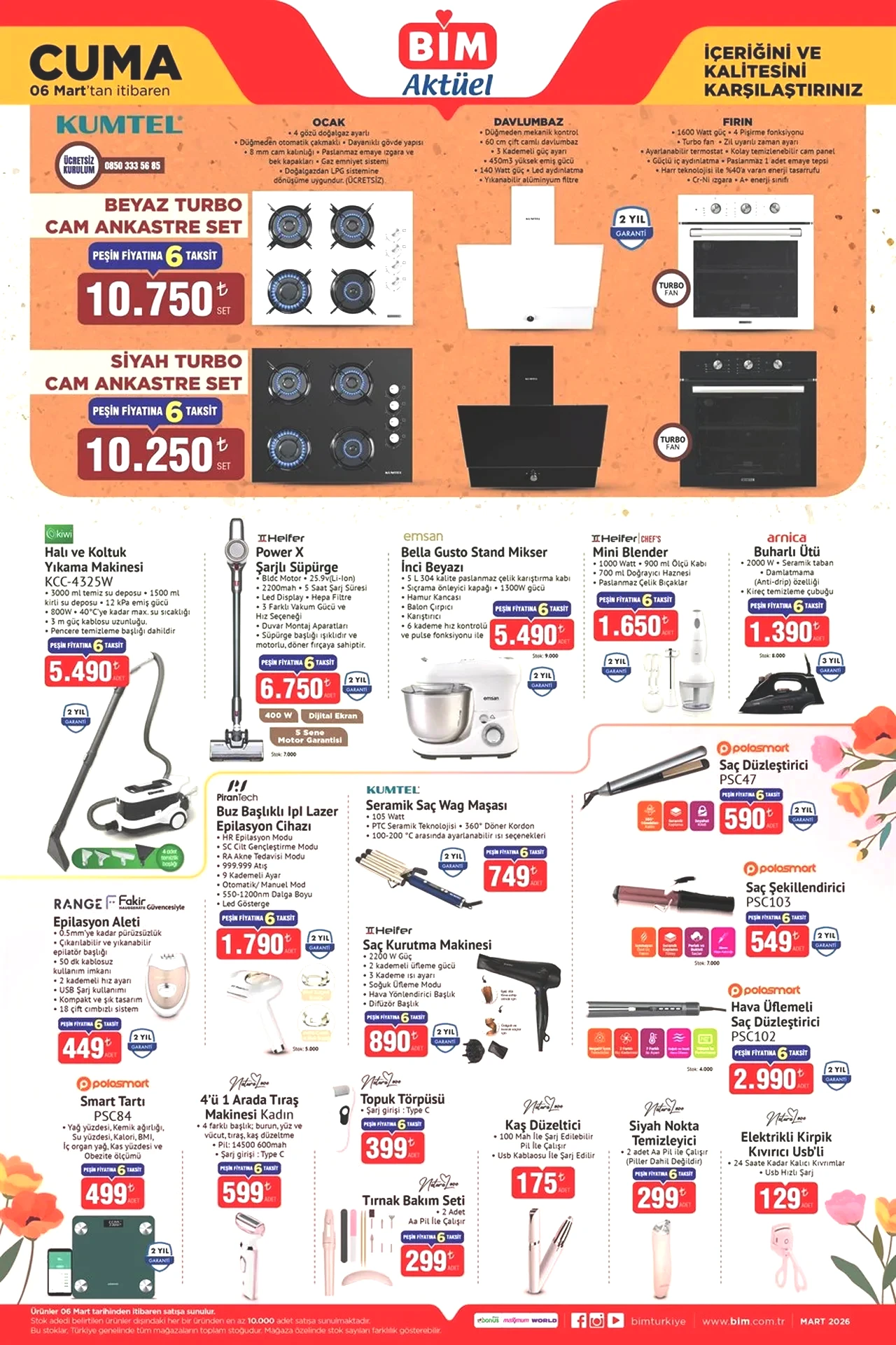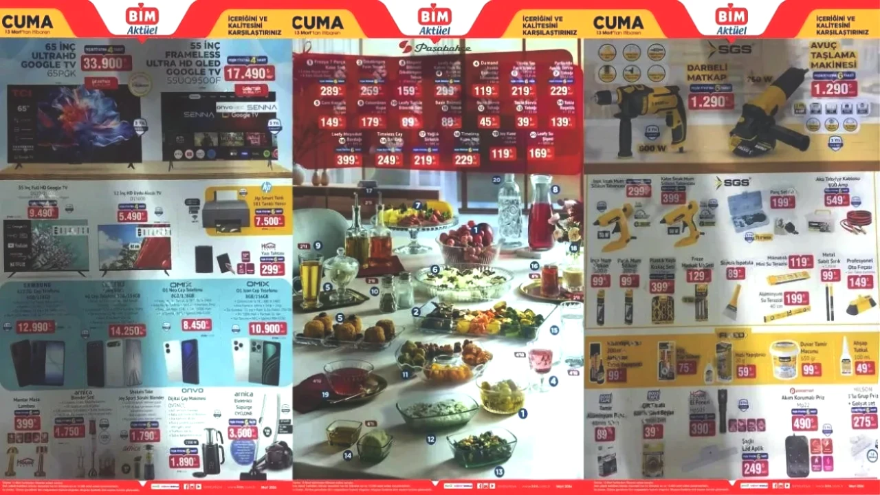 BİM'in yeni hafta indirimleri nihayet açıklandı. 6 Mart Cuma günü beyaz turbo camlı ankastre set 10.750 TL, siyah versiyonu ise 10.250 TL'den mutfaklarını yenilemek isteyen müşterilere sunulacak. Ayrıca, halı ve koltuk yıkama makinesi 5.490 TL, buharlı ütü 1.390 TL, şarj edilebilir süpürge 6.750 TL, stand mikser 5.490 TL ve mini blender ise 1.650 TL'ye satışa çıkarılacak. Mutfak eşyalarının yanı sıra kadınlara özel saç şekillendirme ürünleri de mevcut. Saç şekillendirici 549 TL, hava üflemeli saç düzleştirici 2.990 TL, saç kurutma makinesi 890 TL, seramik saç wag maşası ise 749 TL'den satışa sunulacak. BİM'in 13 Mart satış kataloğunda yapı market ürünleri, dört farklı televizyon ve akıllı telefon modeli de yer alıyor. Darbeli matkaplardan, 65 inç ultra HD televizyonlara kadar pek çok ürün indirime girecek. Peki, BİM'de bu hafta neler mevcut? İşte BİM 6-13 Mart aktüel kataloğundaki indirimler ve fiyat listeleri...