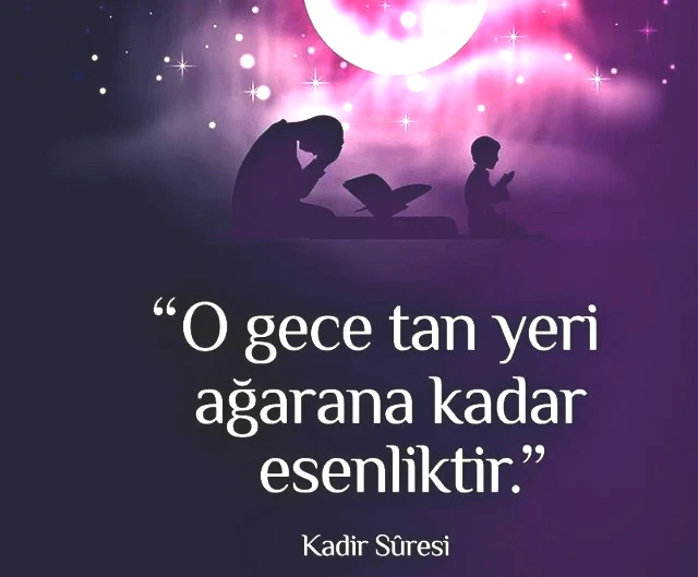 Kadir gecesi, bin aydan daha hayırlıdır. O gece melekler ve ruh, Rablerinin izniyle her bir iş için iner dururlar. O gece tan yeri ağarıncaya kadar esenlik doludur. (Kadir Suresi 3-4-5. ayet)